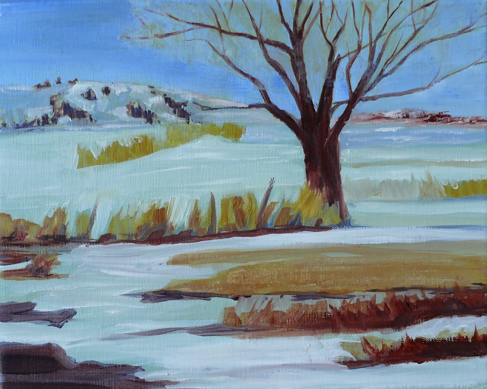 I worked this painting differently today. I painted all of the darks with a combination of ultramarine and black. Then I painted all of the lights. I painted burnt sienna over the darkest landscape areas. Viridian and zinc yellow and white in various combinations over the landscape.